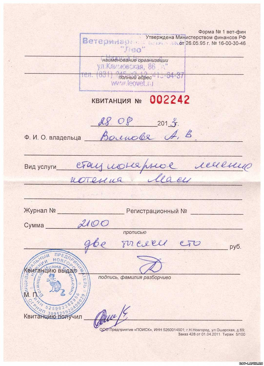 | Вчера оплатила в клинике за него 2100 руб.