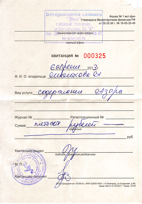 | - 2500руб за стационарное лечение Азора из НАЛИЧНЫХ (стационар проплачен по 10.04.2013):
