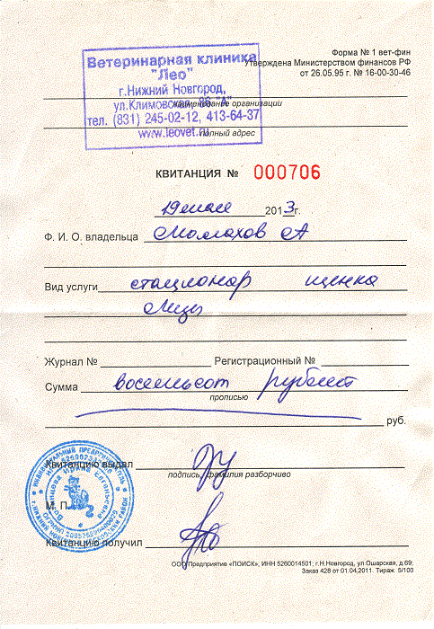 | - 550руб НАЛИЧНЫМИ за стационарное содержание щенка Лизы:
